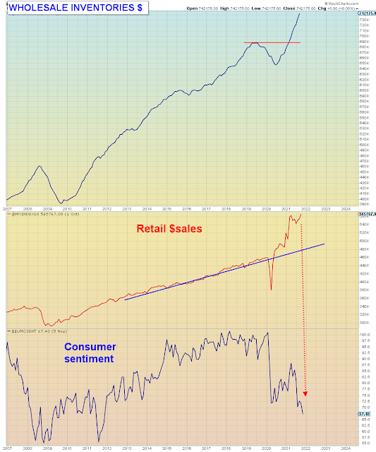 Basically what happened is that the pandemic shut down supply chains and depleted inventories. This created a massive temporary supply demand imbalance. Profiteers took advantage of the situation by raising prices, which set off a buying panic that was accelerated by the wealth effect. Here we see below that wholesale inventories have recovered and retail sales are now diverging massively from consumer sentiment.